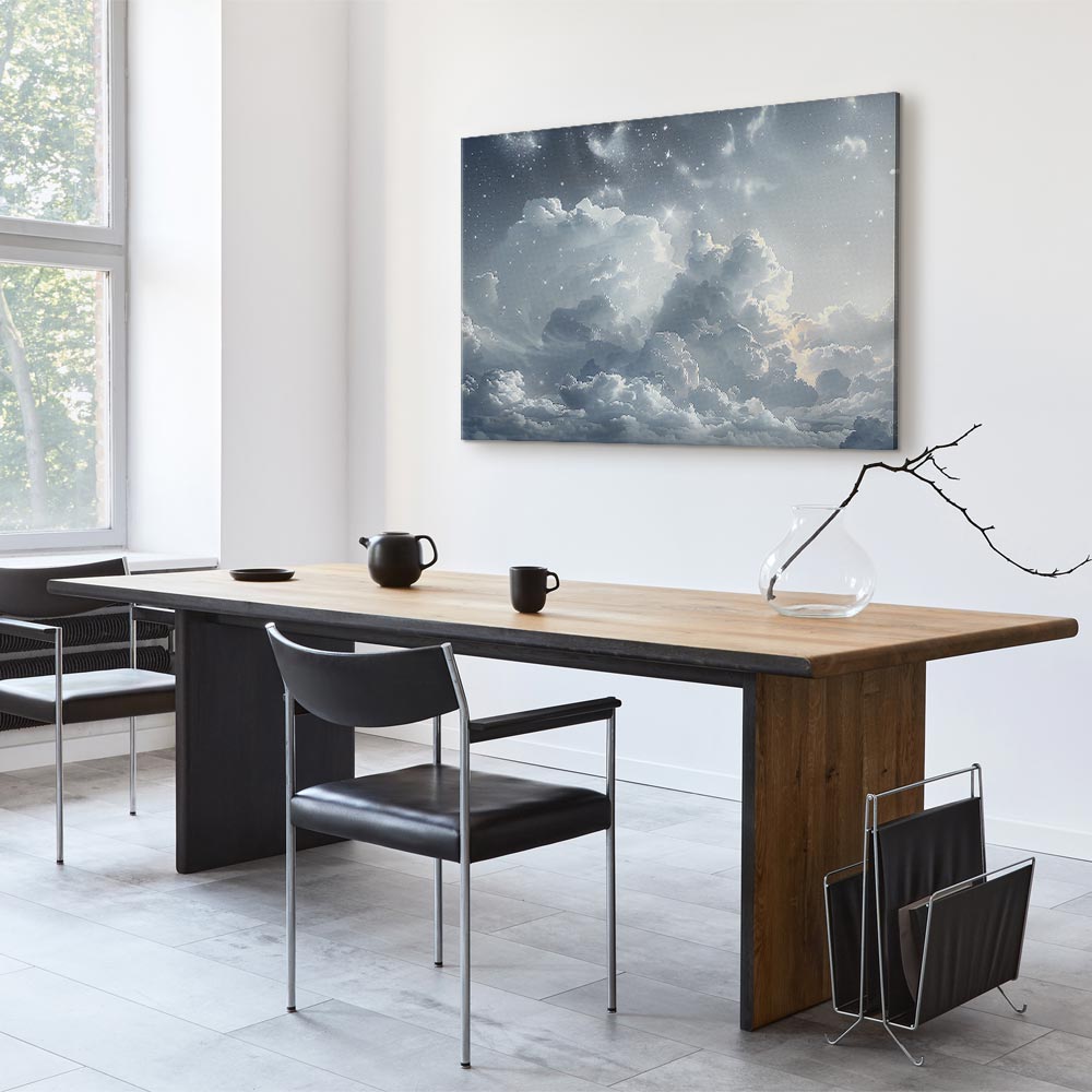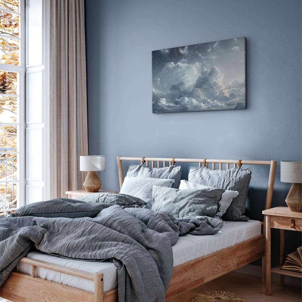 Unsere Bilder sind sicher und geruchsneutral und eignen sich daher ideal für Kinderzimmer. Die Größe wird Ihr Kind sicher beeindrucken! Bilder für Schlafzimmer sind ein echter Blickfang, genauso wie Bilder Wohnzimmer. Dekorieren Sie die Wände in Ihrem privaten Bereich mit einem Bild „Leinwandbild – Astral Calm: Stars Scattered Over Delicate Clouds“. Wir empfehlen Bilder für Schlafzimmer , die Sie beruhigen und in eine erholsame Stimmung versetzen. Bilder aus unserer Kollektion werden Ihrem Interieur eine außergewöhnliche Atmosphäre verleihen. Unabhängig vom Raum schaffen auch Kunst Bilder eine gemütliche Atmosphäre für die Gäste. Massive Holzrahmen unterstreichen den einzigartigen Charakter der Schlafzimmerbilder, und ein schneller und sicherer Versand ist ein weiterer Vorteil, der für diese Wanddekorationen spricht Leinwandbilder sind in fünf Varianten erhältlich, sodass jeder Kunde die perfekte Option für seine Bedürfnisse findet.Die Variante auf Strukturleinwand (Standard) ist eine universelle Dekoration, die das Haushaltsbudget nicht belastet.Für Liebhaber edler Materialien ist ein Druck auf italienischer Leinwand aus 100 % Baumwolle die ideale Wahl.Und für Fans der Malerei? Hier überzeugt die außergewöhnliche Premium-Print-Technik – ein Bild, das auf Strukturleinwand gedruckt und von Hand mit einer Schicht transparenten Gels überzogen wird, die die Pinselstriche eines Künstlers imitiert – ein „wie gemalt“-Effekt, aber zu einem günstigeren Preis.Die Variante im soliden Holzrahmen des Typs American Box mit Tiefeneffekt (zwei Rahmenfarben zur Auswahl, Motiv auf Strukturleinwand gedruckt) bietet eine klassische Lösung in neuer Form.Das Akustikbild (Druck auf Strukturleinwand mit einer zusätzlichen Schicht schallabsorbierendem Schaumstoff) ist dagegen ein Volltreffer für alle, die Ästhetik mit Funktionalität verbinden möchten.Zwar sind die beiden letzten Optionen nur für bestimmte Größen von einteiligen Bildern verfügbar, doch bei allen Varianten legen wir GRATIS die erforderliche Anzahl an Haken und Nägeln zur Montage bei.