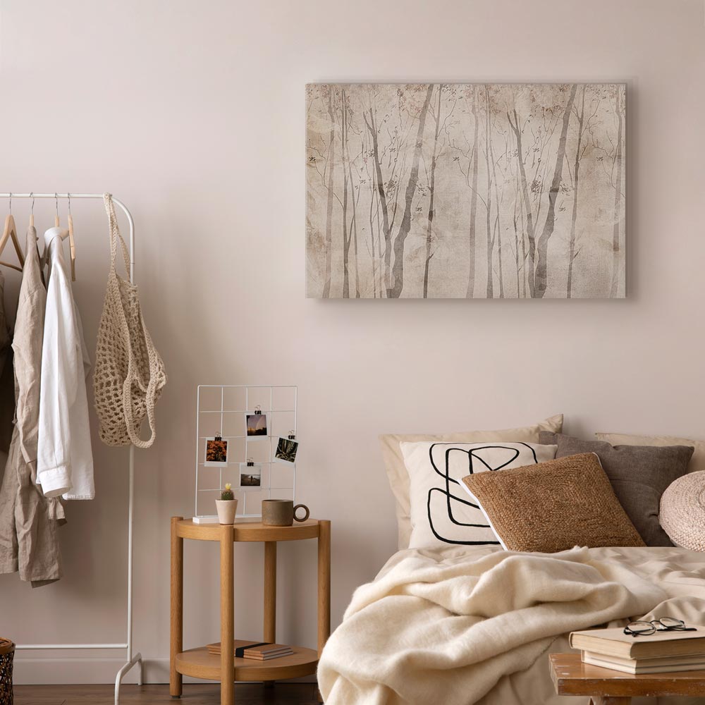 Unsere Bilder sind sicher und geruchsneutral und eignen sich daher ideal für Kinderzimmer. Die Größe wird Ihr Kind sicher beeindrucken! Bilder für Schlafzimmer sind ein echter Blickfang, genauso wie Bilder Wohnzimmer. Dekorieren Sie die Wände in Ihrem privaten Bereich mit einem Bild „Leinwandbild – Beige Forest of Thoughts (1 Part) Wide“. Wir empfehlen Bilder für Schlafzimmer , die Sie beruhigen und in eine erholsame Stimmung versetzen. Bilder aus unserer Kollektion werden Ihrem Interieur eine außergewöhnliche Atmosphäre verleihen. Unabhängig vom Raum schaffen auch Kunst Bilder eine gemütliche Atmosphäre für die Gäste. Massive Holzrahmen unterstreichen den einzigartigen Charakter der Schlafzimmerbilder, und ein schneller und sicherer Versand ist ein weiterer Vorteil, der für diese Wanddekorationen spricht Leinwandbilder sind in fünf Varianten erhältlich, sodass jeder Kunde die perfekte Option für seine Bedürfnisse findet.Die Variante auf Strukturleinwand (Standard) ist eine universelle Dekoration, die das Haushaltsbudget nicht belastet.Für Liebhaber edler Materialien ist ein Druck auf italienischer Leinwand aus 100 % Baumwolle die ideale Wahl.Und für Fans der Malerei? Hier überzeugt die außergewöhnliche Premium-Print-Technik – ein Bild, das auf Strukturleinwand gedruckt und von Hand mit einer Schicht transparenten Gels überzogen wird, die die Pinselstriche eines Künstlers imitiert – ein „wie gemalt“-Effekt, aber zu einem günstigeren Preis.Die Variante im soliden Holzrahmen des Typs American Box mit Tiefeneffekt (zwei Rahmenfarben zur Auswahl, Motiv auf Strukturleinwand gedruckt) bietet eine klassische Lösung in neuer Form.Das Akustikbild (Druck auf Strukturleinwand mit einer zusätzlichen Schicht schallabsorbierendem Schaumstoff) ist dagegen ein Volltreffer für alle, die Ästhetik mit Funktionalität verbinden möchten.Zwar sind die beiden letzten Optionen nur für bestimmte Größen von einteiligen Bildern verfügbar, doch bei allen Varianten legen wir GRATIS die erforderliche Anzahl an Haken und Nägeln zur Montage bei.