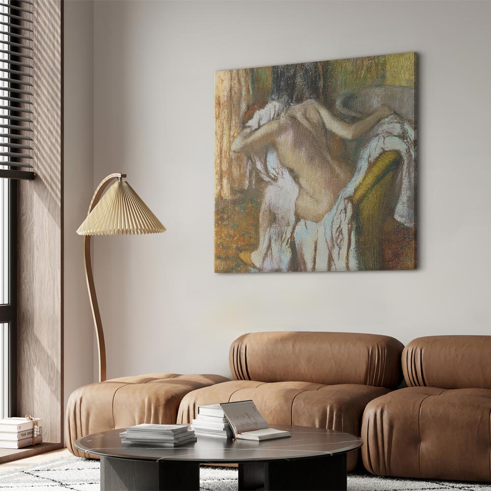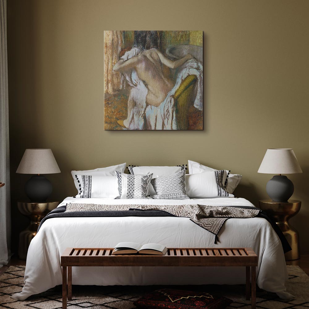 Unsere Bilder sind sicher und geruchsneutral und eignen sich daher ideal für Kinderzimmer. Die Größe wird Ihr Kind sicher beeindrucken! Bilder für Schlafzimmer sind ein echter Blickfang, genauso wie Bilder Wohnzimmer. Dekorieren Sie die Wände in Ihrem privaten Bereich mit einem Bild „Leinwandbild – Edgar Degas – Woman drying herself“. Wir empfehlen Bilder für Schlafzimmer , die Sie beruhigen und in eine erholsame Stimmung versetzen. Bilder aus unserer Kollektion werden Ihrem Interieur eine außergewöhnliche Atmosphäre verleihen. Unabhängig vom Raum schaffen auch Kunst Bilder eine gemütliche Atmosphäre für die Gäste. Massive Holzrahmen unterstreichen den einzigartigen Charakter der Schlafzimmerbilder, und ein schneller und sicherer Versand ist ein weiterer Vorteil, der für diese Wanddekorationen spricht Leinwandbilder sind in fünf Varianten erhältlich, sodass jeder Kunde die perfekte Option für seine Bedürfnisse findet.Die Variante auf Strukturleinwand (Standard) ist eine universelle Dekoration, die das Haushaltsbudget nicht belastet.Für Liebhaber edler Materialien ist ein Druck auf italienischer Leinwand aus 100 % Baumwolle die ideale Wahl.Und für Fans der Malerei? Hier überzeugt die außergewöhnliche Premium-Print-Technik – ein Bild, das auf Strukturleinwand gedruckt und von Hand mit einer Schicht transparenten Gels überzogen wird, die die Pinselstriche eines Künstlers imitiert – ein „wie gemalt“-Effekt, aber zu einem günstigeren Preis.Die Variante im soliden Holzrahmen des Typs American Box mit Tiefeneffekt (zwei Rahmenfarben zur Auswahl, Motiv auf Strukturleinwand gedruckt) bietet eine klassische Lösung in neuer Form.Das Akustikbild (Druck auf Strukturleinwand mit einer zusätzlichen Schicht schallabsorbierendem Schaumstoff) ist dagegen ein Volltreffer für alle, die Ästhetik mit Funktionalität verbinden möchten.Zwar sind die beiden letzten Optionen nur für bestimmte Größen von einteiligen Bildern verfügbar, doch bei allen Varianten legen wir GRATIS die erforderliche Anzahl an Haken und Nägeln zur Montage bei.