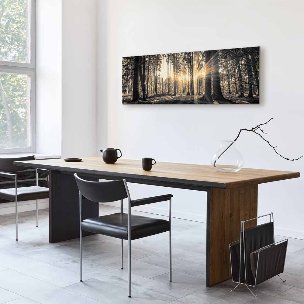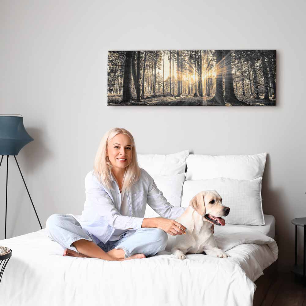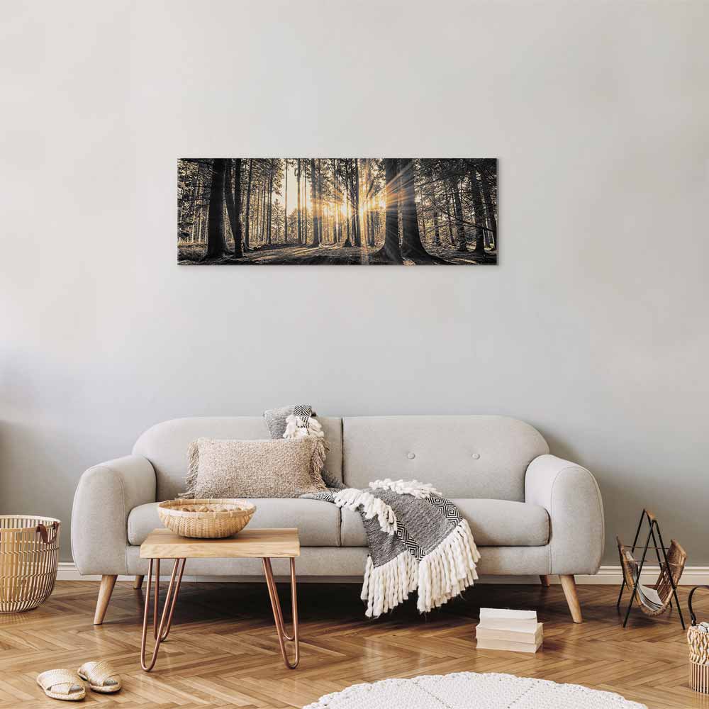 Unsere Bilder sind sicher und geruchsneutral und eignen sich daher ideal für Kinderzimmer. Die Größe wird Ihr Kind sicher beeindrucken! Bilder für Schlafzimmer sind ein echter Blickfang, genauso wie Bilder Wohnzimmer. Dekorieren Sie die Wände in Ihrem privaten Bereich mit einem Bild „Leinwandbild – Forest Sun“. Wir empfehlen Bilder für Schlafzimmer , die Sie beruhigen und in eine erholsame Stimmung versetzen. Bilder aus unserer Kollektion werden Ihrem Interieur eine außergewöhnliche Atmosphäre verleihen. Unabhängig vom Raum schaffen auch Kunst Bilder eine gemütliche Atmosphäre für die Gäste. Massive Holzrahmen unterstreichen den einzigartigen Charakter der Schlafzimmerbilder, und ein schneller und sicherer Versand ist ein weiterer Vorteil, der für diese Wanddekorationen spricht Leinwandbilder sind in fünf Varianten erhältlich, sodass jeder Kunde die perfekte Option für seine Bedürfnisse findet.Die Variante auf Strukturleinwand (Standard) ist eine universelle Dekoration, die das Haushaltsbudget nicht belastet.Für Liebhaber edler Materialien ist ein Druck auf italienischer Leinwand aus 100 % Baumwolle die ideale Wahl.Und für Fans der Malerei? Hier überzeugt die außergewöhnliche Premium-Print-Technik – ein Bild, das auf Strukturleinwand gedruckt und von Hand mit einer Schicht transparenten Gels überzogen wird, die die Pinselstriche eines Künstlers imitiert – ein „wie gemalt“-Effekt, aber zu einem günstigeren Preis.Die Variante im soliden Holzrahmen des Typs American Box mit Tiefeneffekt (zwei Rahmenfarben zur Auswahl, Motiv auf Strukturleinwand gedruckt) bietet eine klassische Lösung in neuer Form.Das Akustikbild (Druck auf Strukturleinwand mit einer zusätzlichen Schicht schallabsorbierendem Schaumstoff) ist dagegen ein Volltreffer für alle, die Ästhetik mit Funktionalität verbinden möchten.Zwar sind die beiden letzten Optionen nur für bestimmte Größen von einteiligen Bildern verfügbar, doch bei allen Varianten legen wir GRATIS die erforderliche Anzahl an Haken und Nägeln zur Montage bei.