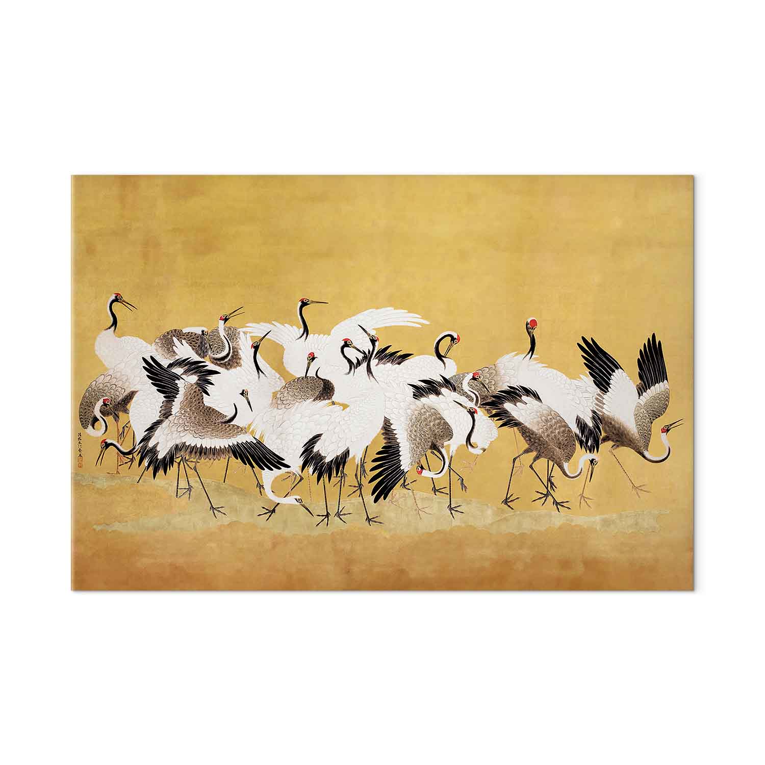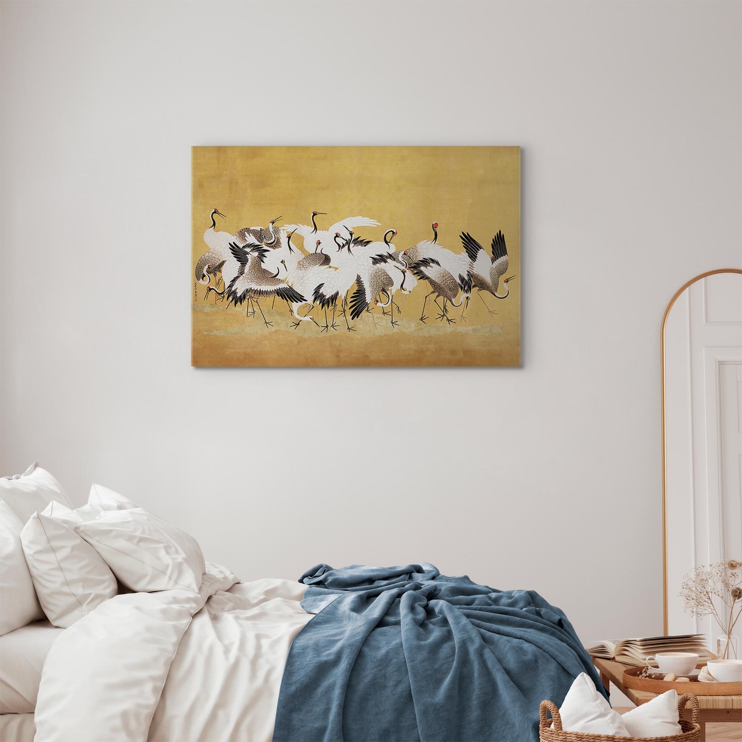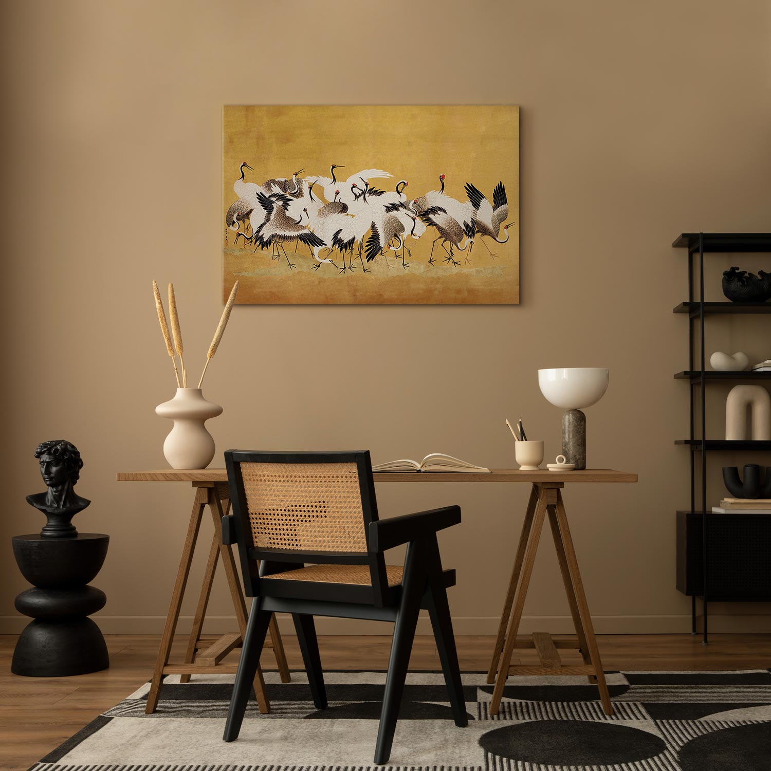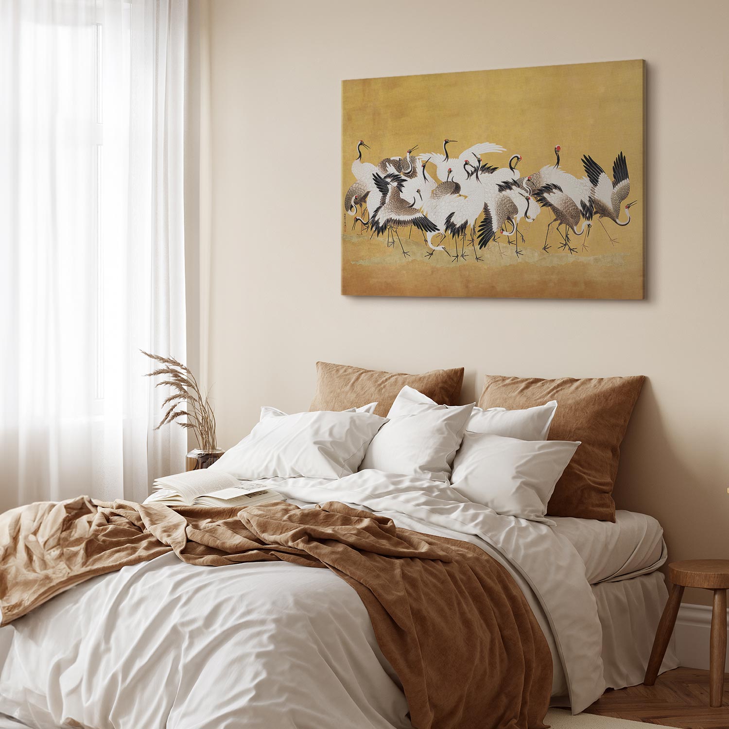 Unsere Bilder sind sicher und geruchsneutral und eignen sich daher ideal für Kinderzimmer. Die Größe wird Ihr Kind sicher beeindrucken! Bilder für Schlafzimmer sind ein echter Blickfang, genauso wie Bilder Wohnzimmer. Dekorieren Sie die Wände in Ihrem privaten Bereich mit einem Bild „Leinwandbild – Japanese cranes – a flock of birds against a golden background based on a painting by Ishida Yūtei“. Wir empfehlen Bilder für Schlafzimmer , die Sie beruhigen und in eine erholsame Stimmung versetzen. Bilder aus unserer Kollektion werden Ihrem Interieur eine außergewöhnliche Atmosphäre verleihen. Unabhängig vom Raum schaffen auch Kunst Bilder eine gemütliche Atmosphäre für die Gäste. Massive Holzrahmen unterstreichen den einzigartigen Charakter der Schlafzimmerbilder, und ein schneller und sicherer Versand ist ein weiterer Vorteil, der für diese Wanddekorationen spricht Leinwandbilder sind in fünf Varianten erhältlich, sodass jeder Kunde die perfekte Option für seine Bedürfnisse findet.Die Variante auf Strukturleinwand (Standard) ist eine universelle Dekoration, die das Haushaltsbudget nicht belastet.Für Liebhaber edler Materialien ist ein Druck auf italienischer Leinwand aus 100 % Baumwolle die ideale Wahl.Und für Fans der Malerei? Hier überzeugt die außergewöhnliche Premium-Print-Technik – ein Bild, das auf Strukturleinwand gedruckt und von Hand mit einer Schicht transparenten Gels überzogen wird, die die Pinselstriche eines Künstlers imitiert – ein „wie gemalt“-Effekt, aber zu einem günstigeren Preis.Die Variante im soliden Holzrahmen des Typs American Box mit Tiefeneffekt (zwei Rahmenfarben zur Auswahl, Motiv auf Strukturleinwand gedruckt) bietet eine klassische Lösung in neuer Form.Das Akustikbild (Druck auf Strukturleinwand mit einer zusätzlichen Schicht schallabsorbierendem Schaumstoff) ist dagegen ein Volltreffer für alle, die Ästhetik mit Funktionalität verbinden möchten.Zwar sind die beiden letzten Optionen nur für bestimmte Größen von einteiligen Bildern verfügbar, doch bei allen Varianten legen wir GRATIS die erforderliche Anzahl an Haken und Nägeln zur Montage bei.