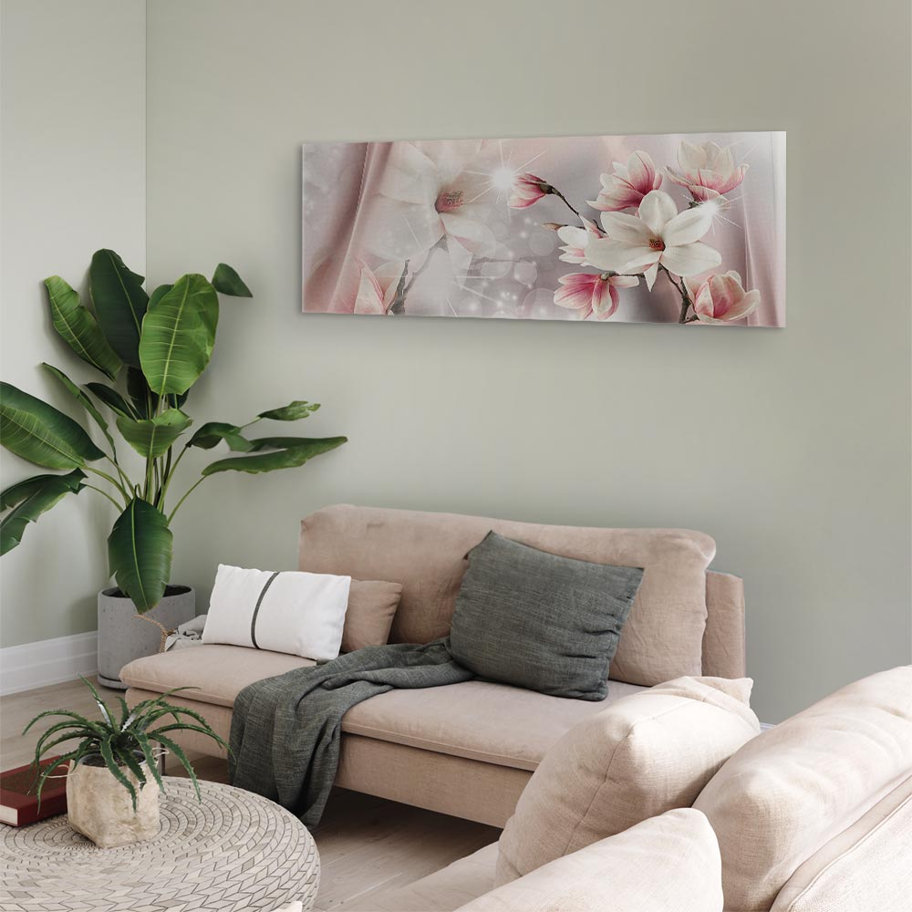 Unsere Bilder sind sicher und geruchsneutral und eignen sich daher ideal für Kinderzimmer. Die Größe wird Ihr Kind sicher beeindrucken! Bilder für Schlafzimmer sind ein echter Blickfang, genauso wie Bilder Wohnzimmer. Dekorieren Sie die Wände in Ihrem privaten Bereich mit einem Bild „Leinwandbild – Magnolia Reflection (1 Part) Narrow“. Wir empfehlen Bilder für Schlafzimmer , die Sie beruhigen und in eine erholsame Stimmung versetzen. Bilder aus unserer Kollektion werden Ihrem Interieur eine außergewöhnliche Atmosphäre verleihen. Unabhängig vom Raum schaffen auch Kunst Bilder eine gemütliche Atmosphäre für die Gäste. Massive Holzrahmen unterstreichen den einzigartigen Charakter der Schlafzimmerbilder, und ein schneller und sicherer Versand ist ein weiterer Vorteil, der für diese Wanddekorationen spricht Leinwandbilder sind in fünf Varianten erhältlich, sodass jeder Kunde die perfekte Option für seine Bedürfnisse findet.Die Variante auf Strukturleinwand (Standard) ist eine universelle Dekoration, die das Haushaltsbudget nicht belastet.Für Liebhaber edler Materialien ist ein Druck auf italienischer Leinwand aus 100 % Baumwolle die ideale Wahl.Und für Fans der Malerei? Hier überzeugt die außergewöhnliche Premium-Print-Technik – ein Bild, das auf Strukturleinwand gedruckt und von Hand mit einer Schicht transparenten Gels überzogen wird, die die Pinselstriche eines Künstlers imitiert – ein „wie gemalt“-Effekt, aber zu einem günstigeren Preis.Die Variante im soliden Holzrahmen des Typs American Box mit Tiefeneffekt (zwei Rahmenfarben zur Auswahl, Motiv auf Strukturleinwand gedruckt) bietet eine klassische Lösung in neuer Form.Das Akustikbild (Druck auf Strukturleinwand mit einer zusätzlichen Schicht schallabsorbierendem Schaumstoff) ist dagegen ein Volltreffer für alle, die Ästhetik mit Funktionalität verbinden möchten.Zwar sind die beiden letzten Optionen nur für bestimmte Größen von einteiligen Bildern verfügbar, doch bei allen Varianten legen wir GRATIS die erforderliche Anzahl an Haken und Nägeln zur Montage bei.