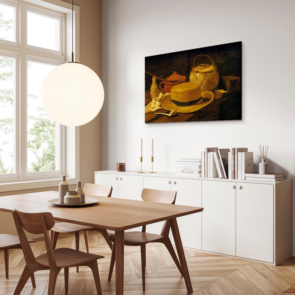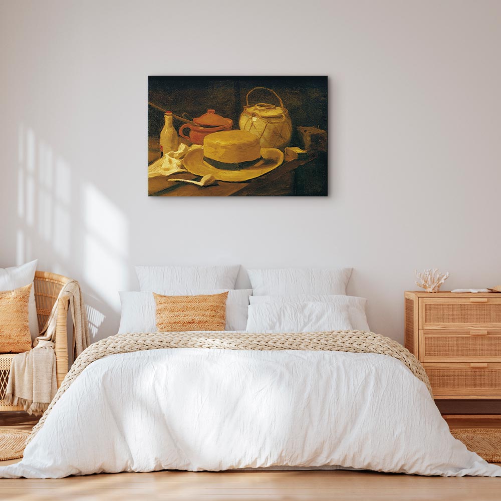 Unsere Bilder sind sicher und geruchsneutral und eignen sich daher ideal für Kinderzimmer. Die Größe wird Ihr Kind sicher beeindrucken! Bilder für Schlafzimmer sind ein echter Blickfang, genauso wie Bilder Wohnzimmer. Dekorieren Sie die Wände in Ihrem privaten Bereich mit einem Bild „Leinwandbild – Vincent Van Gogh – Still life with yellow straw hat“. Wir empfehlen Bilder für Schlafzimmer , die Sie beruhigen und in eine erholsame Stimmung versetzen. Bilder aus unserer Kollektion werden Ihrem Interieur eine außergewöhnliche Atmosphäre verleihen. Unabhängig vom Raum schaffen auch Kunst Bilder eine gemütliche Atmosphäre für die Gäste. Massive Holzrahmen unterstreichen den einzigartigen Charakter der Schlafzimmerbilder, und ein schneller und sicherer Versand ist ein weiterer Vorteil, der für diese Wanddekorationen spricht Leinwandbilder sind in fünf Varianten erhältlich, sodass jeder Kunde die perfekte Option für seine Bedürfnisse findet.Die Variante auf Strukturleinwand (Standard) ist eine universelle Dekoration, die das Haushaltsbudget nicht belastet.Für Liebhaber edler Materialien ist ein Druck auf italienischer Leinwand aus 100 % Baumwolle die ideale Wahl.Und für Fans der Malerei? Hier überzeugt die außergewöhnliche Premium-Print-Technik – ein Bild, das auf Strukturleinwand gedruckt und von Hand mit einer Schicht transparenten Gels überzogen wird, die die Pinselstriche eines Künstlers imitiert – ein „wie gemalt“-Effekt, aber zu einem günstigeren Preis.Die Variante im soliden Holzrahmen des Typs American Box mit Tiefeneffekt (zwei Rahmenfarben zur Auswahl, Motiv auf Strukturleinwand gedruckt) bietet eine klassische Lösung in neuer Form.Das Akustikbild (Druck auf Strukturleinwand mit einer zusätzlichen Schicht schallabsorbierendem Schaumstoff) ist dagegen ein Volltreffer für alle, die Ästhetik mit Funktionalität verbinden möchten.Zwar sind die beiden letzten Optionen nur für bestimmte Größen von einteiligen Bildern verfügbar, doch bei allen Varianten legen wir GRATIS die erforderliche Anzahl an Haken und Nägeln zur Montage bei.
