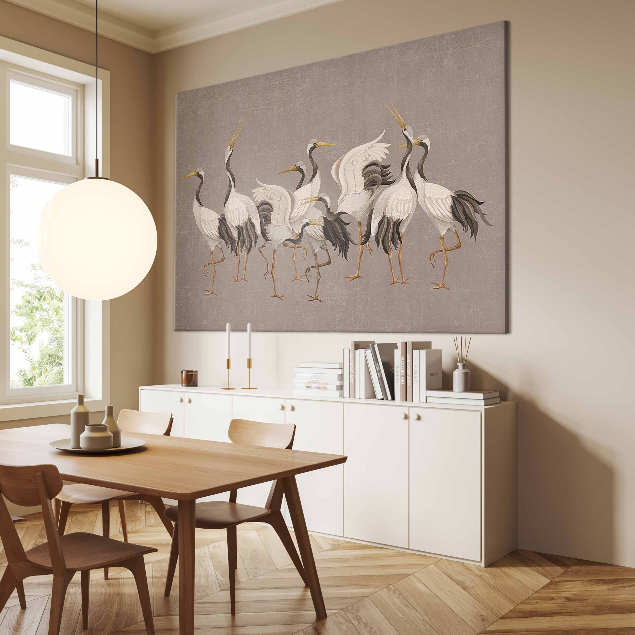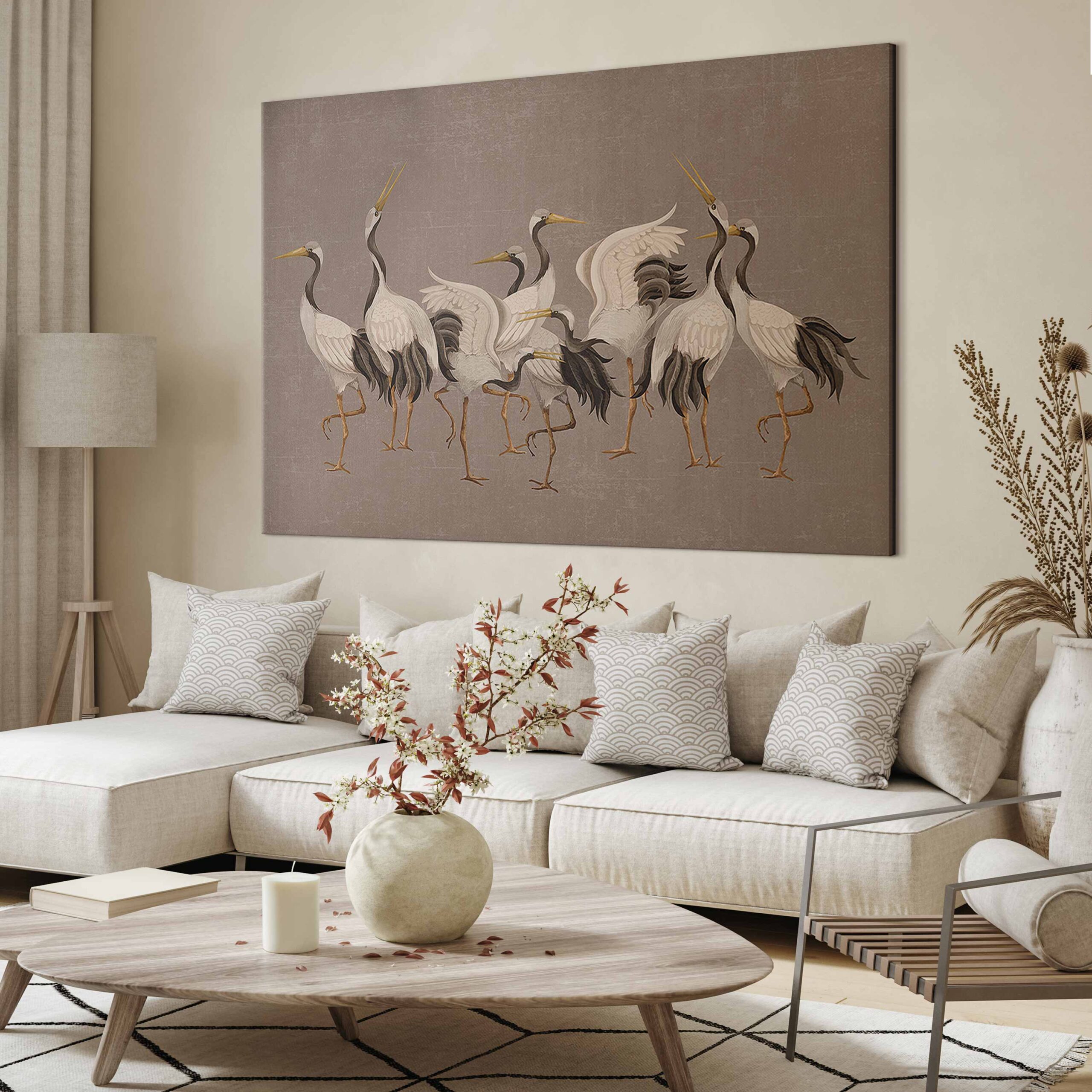 Entdecken Sie den neuen Dekotrend mit unseren innovativen faltbaren großen Leinwandbildern im XXL-Format. Diese einzigartigen Produkte kombinieren modernes Design, höchste Materialqualität und eine vollständig eigenständige DIY-Montageweise und bieten so eine einzigartige Lösung für alle Liebhaber origineller Arrangements. Dank der durchdachten Konstruktion aus Basisrahmen und Leinwand mit aufgedrucktem Motiv können wir auch sehr große Bilder sicher und kosteneffizient liefern. Unser Unterscheidungsmerkmal ist die außergewöhnliche Leichtigkeit bei gleichzeitig voller Rahmenstabilität, die Langlebigkeit gewährleistet und die Montage an jeder Wandart ermöglicht. Die Schritt-für-Schritt-Anleitung stellt sicher, dass jede Kundin und jeder Kunde die Montage problemlos bewältigt. „Wandbild XXL – Crane dance – bright silhouettes of birds against a warm grey background with texture“ ist somit die perfekte Option für Personen, die großformatige Kunstwerke schätzen, die sich ohne professionelle Hilfe leicht montieren lassen.
